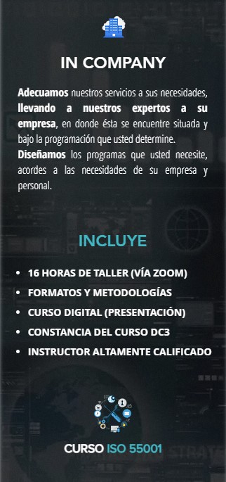 Conocer la metodología para implementar la norma ISO 55001, con la finalidad de optimizar recursos y fomentar la competitividad como impulsor de la mejora del desempeño de la organización. Asi como desarrollar competencia como implementador del sistema de gestión de activos.